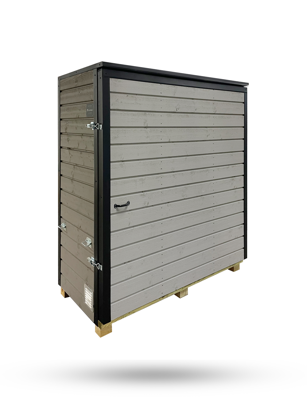 Skåpet är isolerat, ventilerat och invändigt klätt med brandskyddande Magnaboard EI60, vilket ger ett säkert skydd året runt i nordiskt klimat. Skåpet är utformat för batterier mellan 5 och 50 kWh och finns i tre storlekar beroende på system.