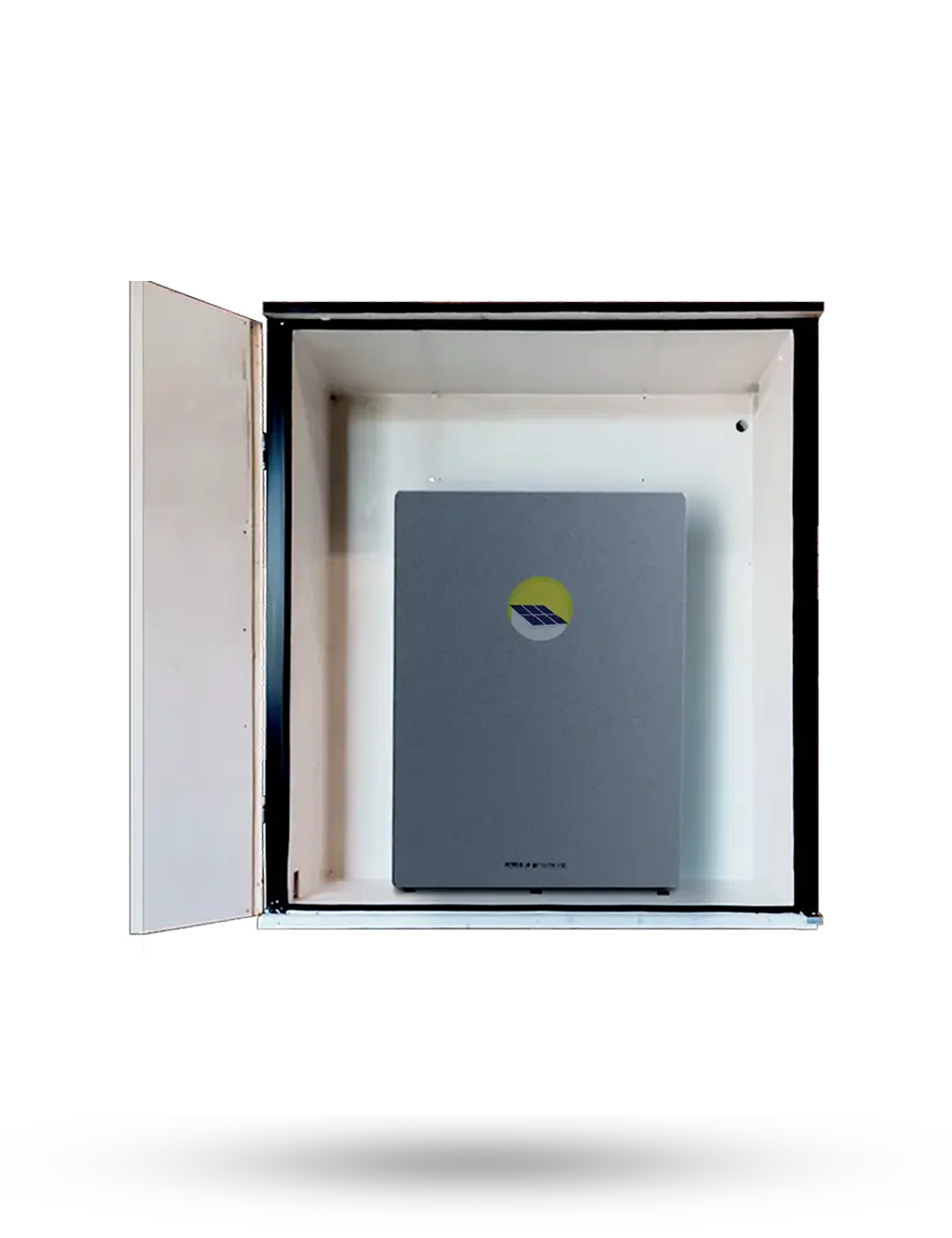 Skåpet är isolerat, ventilerat och invändigt klätt med brandskyddande Magnaboard EI60, vilket ger ett säkert skydd året runt i nordiskt klimat. Skåpet är utformat för batterier mellan 5 och 50 kWh och finns i två storlekar beroende på system.