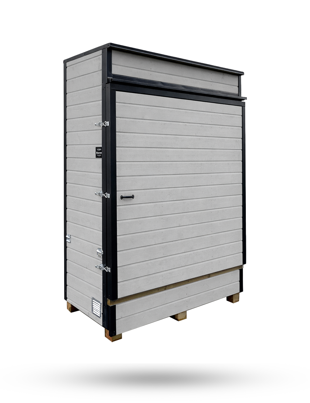 Skåpet är isolerat, ventilerat och invändigt klätt med brandskyddande Magnaboard EI60, vilket ger ett säkert skydd året runt i nordiskt klimat. Skåpet är utformat för batterier mellan 5 och 50 kWh och finns i tre storlekar beroende på system.