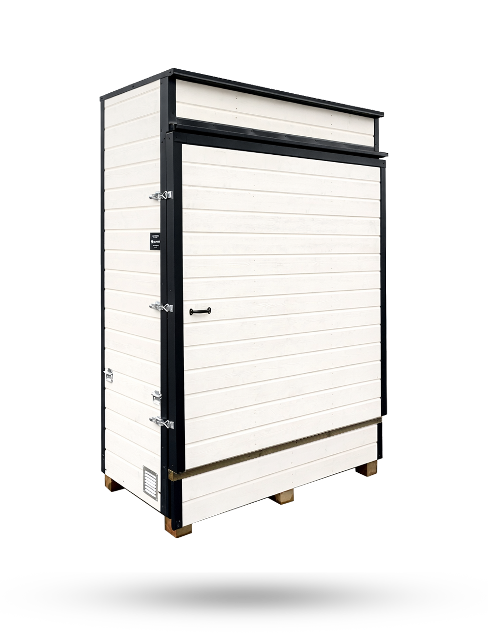 Skåpet är isolerat, ventilerat och invändigt klätt med brandskyddande Magnaboard EI60, vilket ger ett säkert skydd året runt i nordiskt klimat. Skåpet är utformat för batterier mellan 5 och 50 kWh och finns i tre storlekar beroende på system.