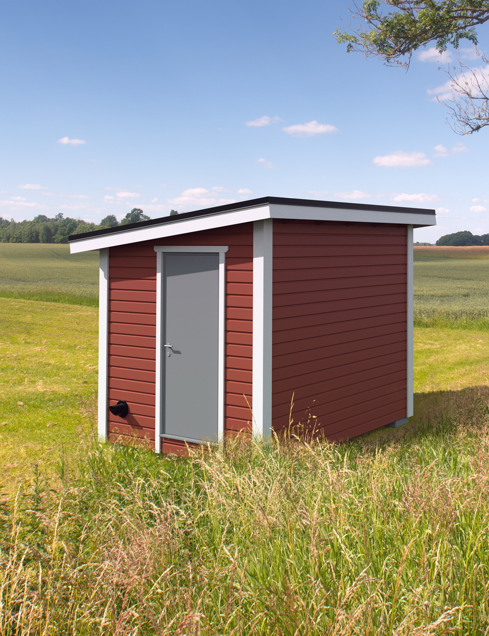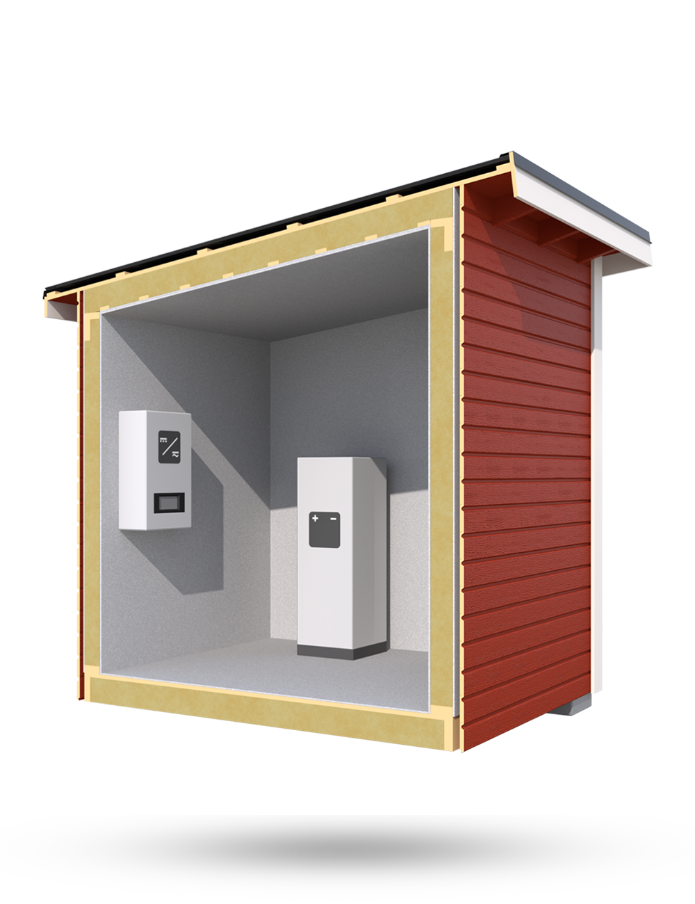 Teknikboden byggd med branklassade material som uppfyller EI60-standard. Boden är 7,5 m² och klassas som en friggebod – ett bygglovsfritt komplementhus som kan placeras på befintlig fastighet.