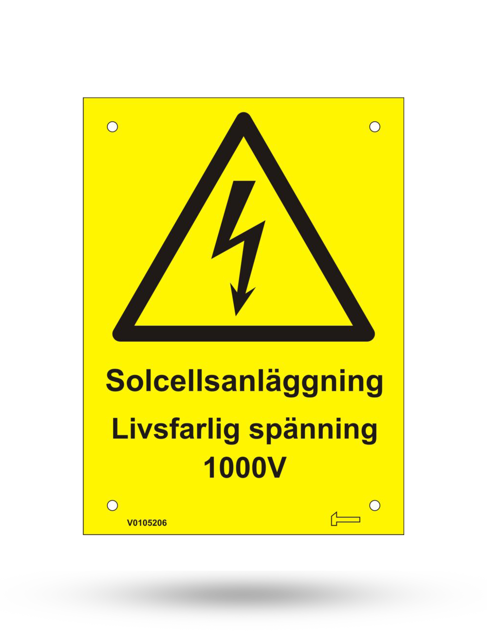 Skylttext: Solcellsanläggning. Livsfarlig spänning. 1000V.